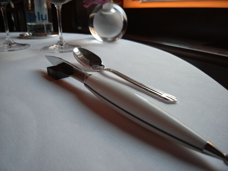 On a du basculer des bennes entières de livres sterling dans le nouveau restaurant du Connaught à Londres, où officie, à temps partiel, Hèlene Darroze. Verrerie, couverts…C’est très agréable de dîner dans un univers où le moindre détail a été mûrement pensé à l’instar de ce spectaculaire couteau de Notron. J’avais oublié de vous indiquer ce que j’avais bu ce soir là.Une bouteille d’eau minérale, un verre de meursault 1er cru