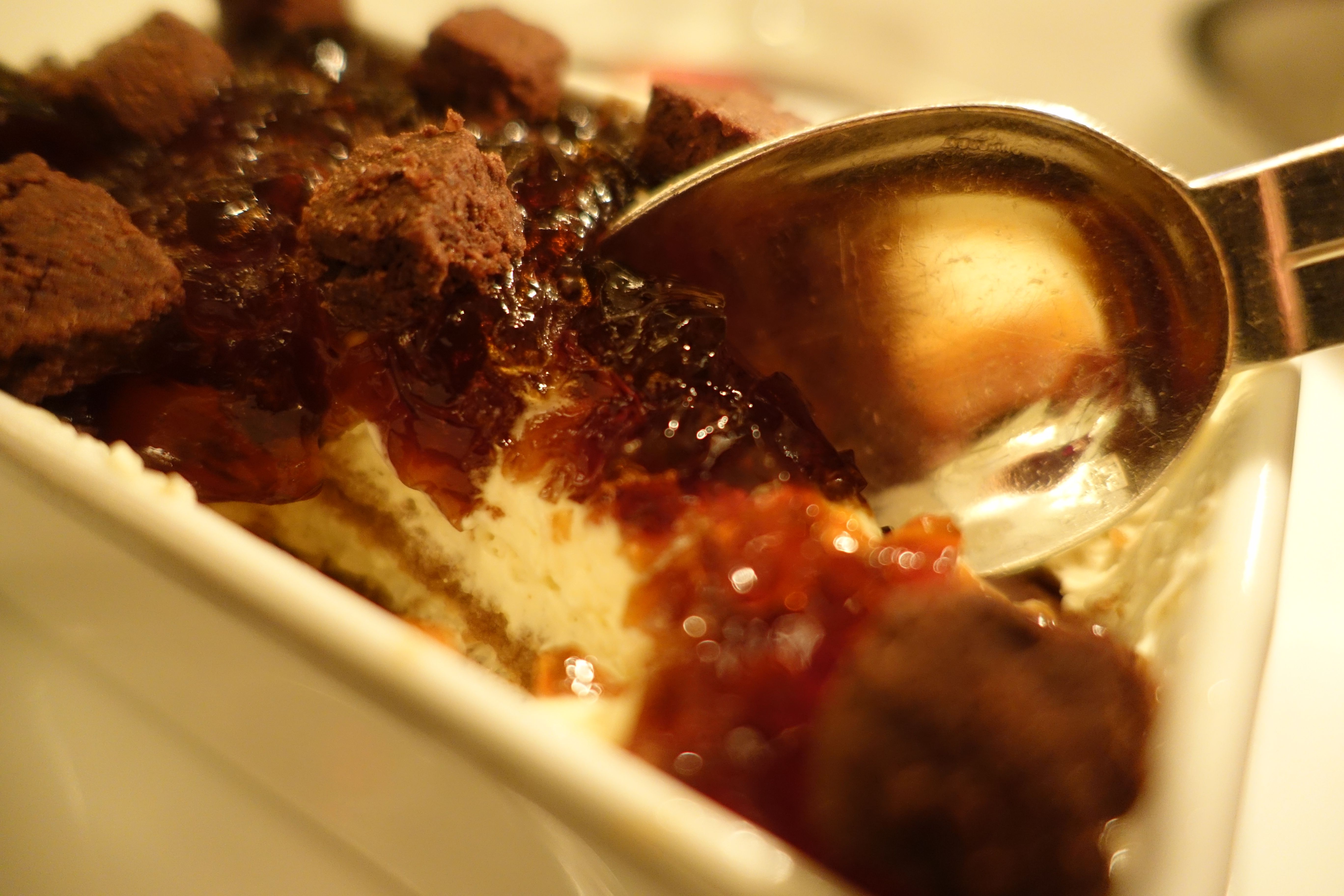 Les prix , on le devine, sont violents et parfois assourdissants (au bord de l’absurde)dans la carte des vins. L’assiette a de jolis gestes, mais reste chiches comme ces tortelli à la carbonara, symboliques et tournoyants ; le risotto, fut il couronné de truffe noir, est laborieux, ne décolle pas et oublie de faire l’ « onda » (ce moment magique entre mouillé et onctueux). Quant au tiramisu réinventé par Pierre Hermé, il est prévisible dans sa façon de faire du Pierre Hermé ; à savoir appuyer très très fort sur les goûts pour exister, oubliant la dimension angélique et scélérate de ce dessert. Clientèle cossue plissant les paupières entre satisfaction et sérénité lasse. Service avec lui aussi ses rythmiques dédoublées : les directeurs dirigeant à contre temps, et les pioupious faisant le travail de gentillesse.