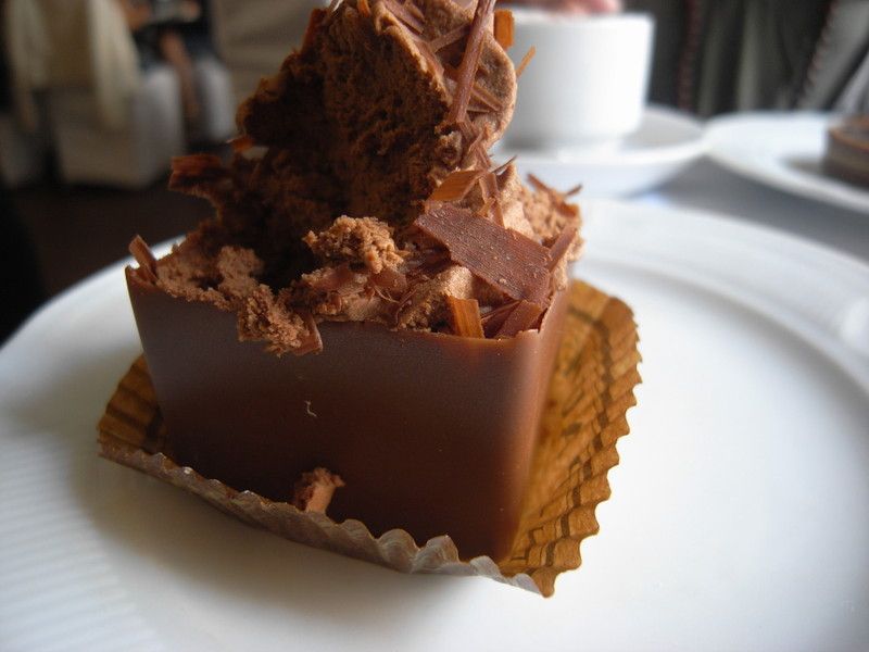 on les comprend, une mousse au chocolat au lait diablement légère, aérienne mais joliment chocolatée ; un superbe travail dans la reconstitution du goût des fèves. On a presque l’impression que le chocolat est parfumé avec une légère touche de fruits rouges. Il n’en est rien, juste le chocolat dans une expression limpide. Un grand moment. Quant à la tarte au chocolat (qui devrait arriver en nouvelle version d’ici peu), il ne faut surtout pas hésiter à la demander chaude. Là, on perd tout contrôle. C’est cinglant, comme un pain en pleine figure. Il n’y a plus de recul possible, on est proprement encastré dans le mur du chocolat. C’est une drôle d’impression car il y a là une véritable intrusion, un choc gustatif. Le chocolat est en vous aussi puissante qu’une intravéneuse. Aussi bon que l’opium.