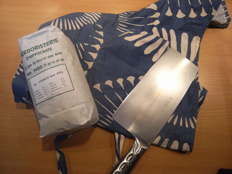 Humm, je ne sais pas pourquoi, je me sens si lointain de ce soir. Bien dormi. Et avant de partir voir de quoi il en retourne, je réalise que je monte la fleur au fusil. Qu’y a t il dans mon sac? Pas grand chose: mon couteau chinois, mon tablier japonais et de l’infusion. Va falloir que je me remue fissa. Pas fait les courses. Livraison des poulets à 11 heures…Bah, aux innocents, le sac vide.