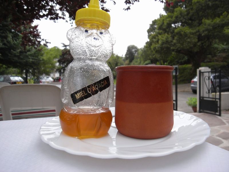 une charmante assiette Arco pâle, un pot de yaourt en terre de France et un biberon de miel d’acacia brodés sur fond de portail forgé dans le fer de lance de Phénix