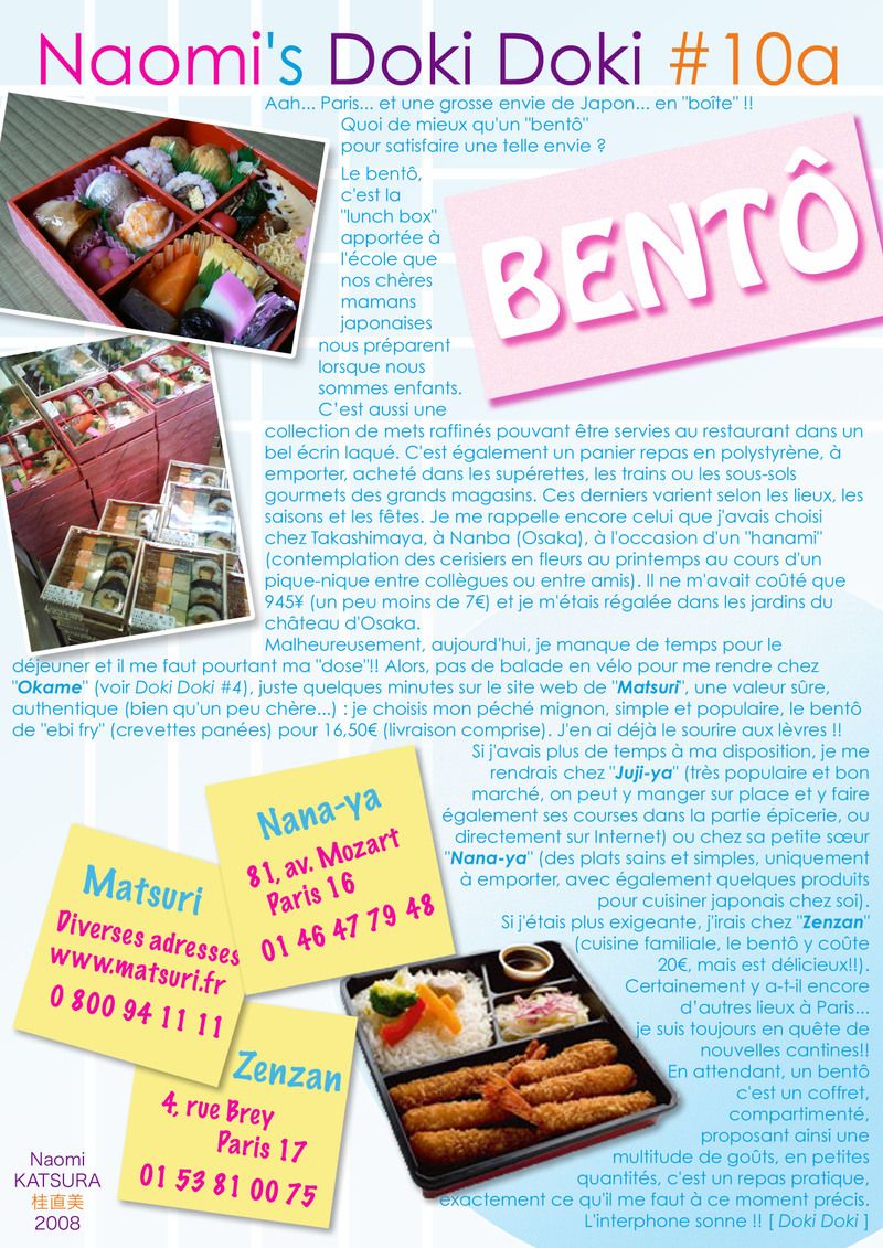 Les Doki Doki de Naomi, c’est toujours aussi simple : il suffit de cliquer dessus (puis en bas à droite) pour que le Japon de Paris et d’ailleurs vous saute à la figure. Cette semaine double dose et ça tombe bien : Naomi nous donne ses bonnes adresses de Bentô à Paris et on adore ça ! Premier livraison pour préparer le déjeuner, la suite dans d’après-midi